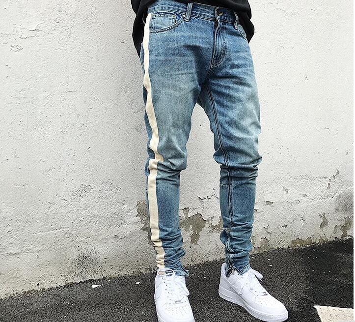 Fashion Kanye West Black Skinny Jeans Men Hip Hop Stripe Ripped Elastic Slim Fit Jeans Men Brand Biker Denim Jogger Design